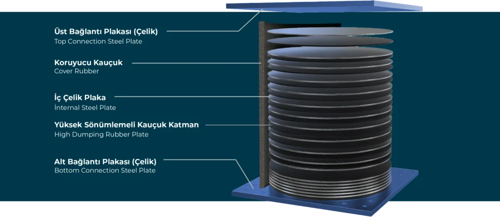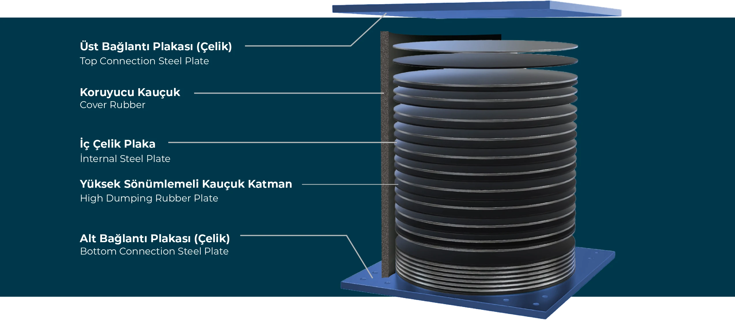 • Doğal kauçuk izolatör, bir üst ve bir alt bağlantı çelik levhalarından, bir üst ve bir alt sızdırmazlık levhalarından, iç doğal kauçuk tabakalardan, iç çelik levhalardan ve bir kauçuk kapaktan oluşur.